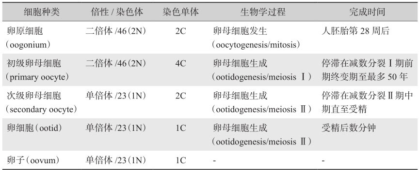 在哺乳动物中,卵子发生起源于胚胎卵巢中PGCs向卵母细胞的分化。其包括几个亚过程(表2-3):卵母细胞发生(oocytogenesis),卵母细胞生成(ootidogenesis),以及最后成熟卵子的形成(卵子形成本身)。卵泡发生(folliculogenesis)是一个独立的子过程,伴随并支持上述三个子过程。PGCs经历有丝分裂,形成了卵原细胞,卵原细胞保持有丝分裂的状态,随后进入减数第一次分裂,历经细线期(leptotene)、偶线期(zygotene)、粗线期(pachytene),最后静止于双线期(diplotene),形成初级卵母细胞。进入青春期后,每次月经周期中仅招募少量的初级卵母细胞,且仅形成一个成熟的卵子。初级卵母细胞于排卵前完成减数第一次分裂,产生单倍体次级卵母细胞并排出第一极体。次级卵母细胞进入减数第二次分裂并停滞于中期,若发生受精,则完成减数分裂过程,排出第二极体。与卵子的发生同步,卵泡从始基卵泡发育成排卵前卵泡。