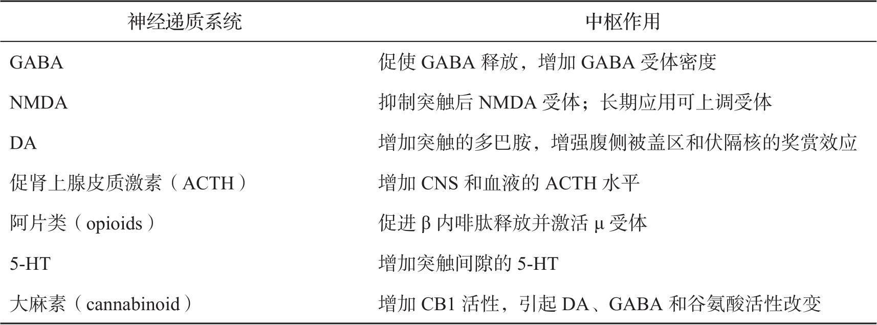 酒精几乎影响所有的脑部系统。横跨各神经化学通路的改变几乎同时发生且可相互影响。酒精可溶于细胞膜脂质,许多主要效应都是通过影响神经递质、配体门控或电压门控性离子通道和G蛋白耦联受体(GPCR)系统来完成。与酒精作用关系密切的中枢神经递质包括γ-氨基丁酸(GABA)、谷氨酸、多巴胺、5-羟色胺(5-HT)和内源性阿片类等。酒精可扰乱脑部兴奋性和抑制性影响之间的平衡,引起抗焦虑、共济失调和镇静作用,这些效应既通过增强抑制性也通过拮抗兴奋性神经传递来完成。酒精的中枢效应可能与同时改变多种能够影响兴奋性的蛋白质的功能有关(表3-2-1)。
