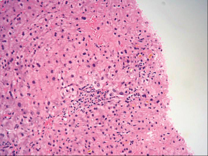 肝细胞胞浆疏松,浑浊,肿大,汇管区轻度界面炎症,周围可见肝细胞气球样变