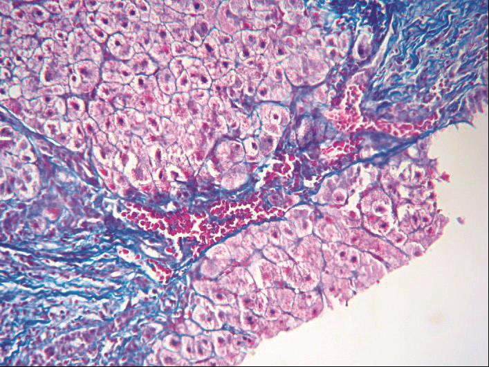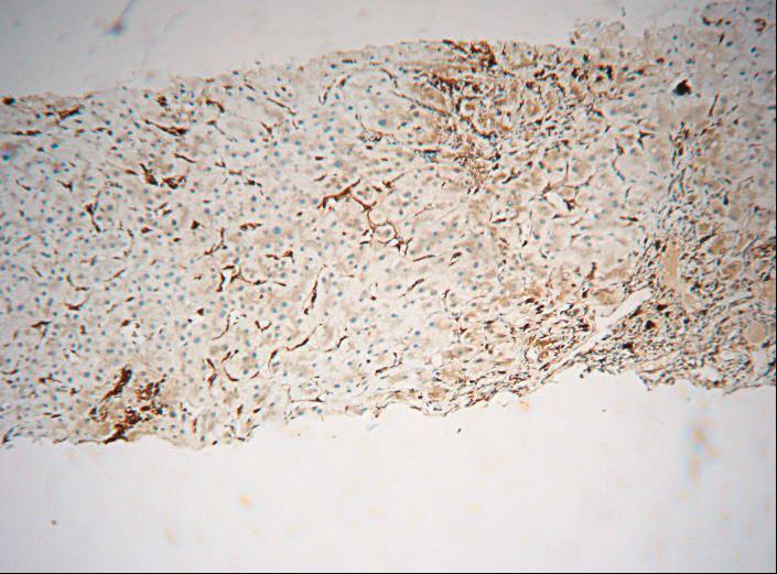 正常中央静脉周围只有薄层胶原纤维,此时静脉壁周围胶原增多,壁轻度增厚,并常伴有小叶中心带的窦周纤维化。用α-SMA做免疫组化染色,在静脉周围及邻近窦周可见增生的HSC,小叶结构保存。