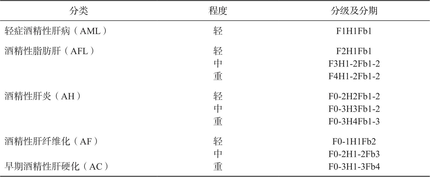 表4-3-2 酒精性肝病的临床分型与组织病理分级、分期的关系