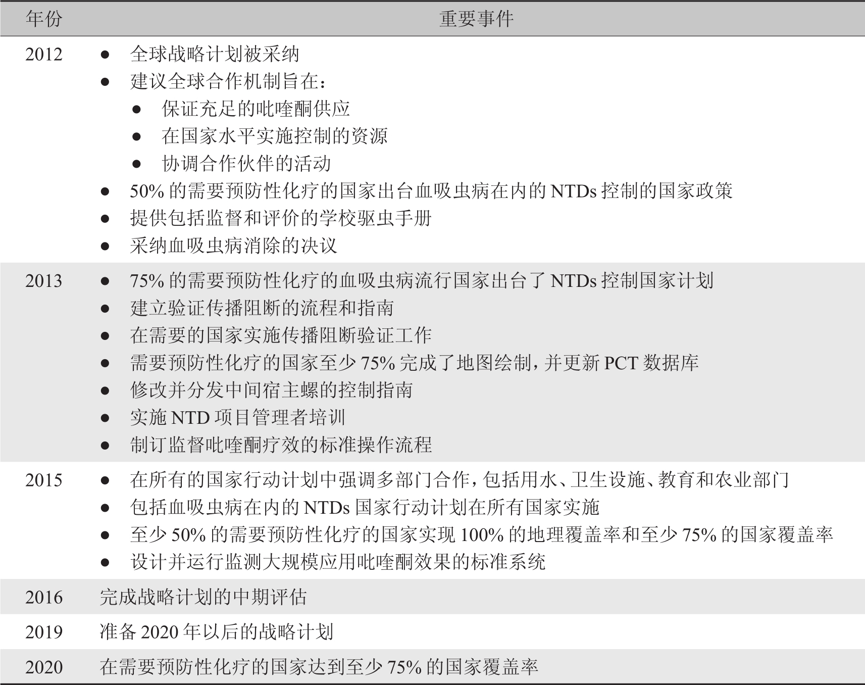 表1-5 全球扩大血吸虫病控制规模工作进展重要时间节点