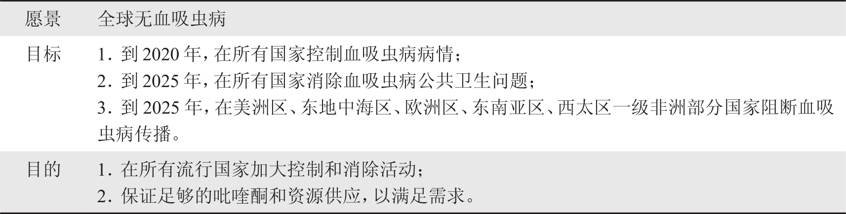 2012年5月,WHA通过了WHA 65.21决议,号召血吸虫病流行国家加大防控和监测力度,整合资源加强综合治理启动血吸虫病消除运动,并希望WHO尽快制订消除血吸虫病的指导原则和停止化疗的验证程序。2012年,WHO发布了《2001—2011年血吸虫病防控进展及2012—2020年战略计划》,提出全球无血吸虫病的愿景,并提出以下目标:2020年全球控制血吸虫病疫情;2025年全球消除血吸虫病公共卫生问题;到2025年,在WHO的美洲区、东地中海区、欧洲区、东南亚区和西太平洋区以及非洲部分国家阻断血吸虫病传播(表1-4)。为实现以上目标,希望通过在所有流行国家扩大控制和消除活动,保证吡喹酮供应量和所需的资源。