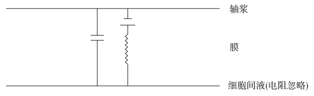综上所述,一小段轴浆和细胞间液的等效电路均是一个电阻器,一小段膜的等效电路则包括:①一个电容(代表膜的绝缘与储存电荷方面);②一个电阻(代表离子通过膜的有限能力);③一个电池,其电压为膜的稳定电压。这一小段轴突的整个等效电路可以表示为: