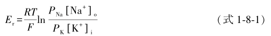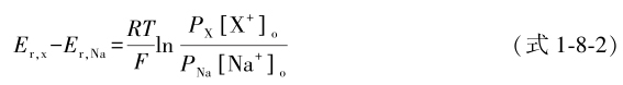 式中 E r 为翻转电位的测定值, RT/F 为常数,膜外Na + 和膜内K + 的浓度([Na + ] o 、[K + ] i )已知,从而可以测出钠通道对K + 的通透程度。对于不能做轴突内灌注的无髓鞘纤维,在假定轴突内成分不变的情况下,可用其他一价阳离子代替Na + 做轴突外灌注,并依下式计算 P x / P Na :