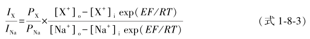 式中 E r,x 和 E r,Na 分别为X + 和Na + 灌注下测得的翻转电位,[X + ] o 和[Na + ] o 分别为待测离子和Na + 在轴突外灌注液中的浓度。在保持电压( E )恒定下,根据离子电流是离子通透系数与作用于离子的推力的乘积,也可用下式计算 P x /P Na :
