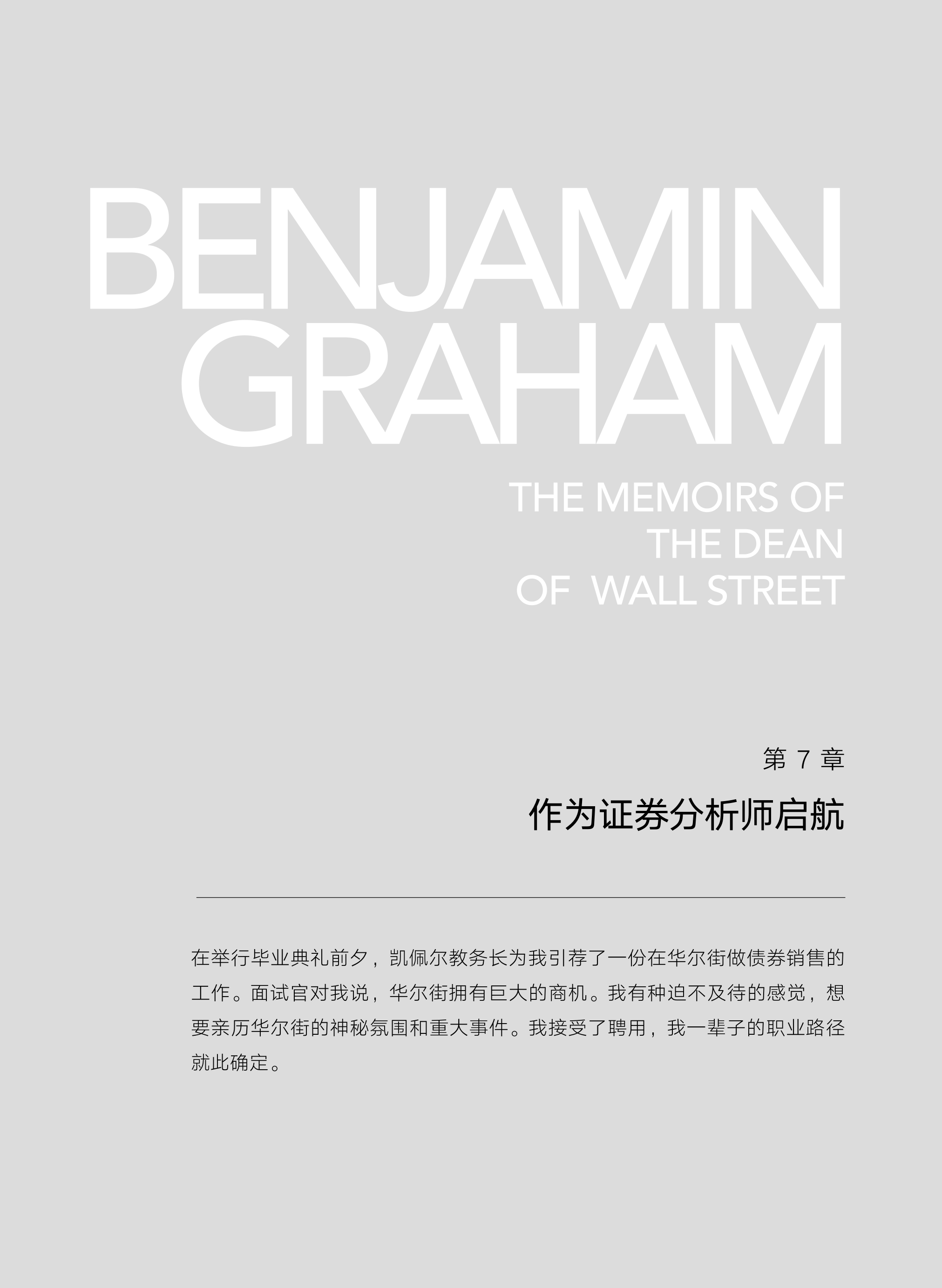 公司开了一个办公会,决定把我的薪水涨到每周15美元。考虑到他们之前在我身上的投资没收到成效等原因,我完全没想到他们会给我涨工资。我对这一薪酬很满意,尤其考虑到我即将真正开启作为证券分析师的职业生涯。几个月后,在业务爆发式增长之际,塞缪尔叫我去他办公室,说我现在可以每周拿18美元的薪水,因此我不用再认为我留下来吃亏了。这标志着我彻底与J. S.巴赫公司无缘了。又过了几个月,我再次获得涨薪,塞缪尔得意地告诉我,如果我当时接受了J. S.巴赫公司的邀请,他的公司就不会再招聘任何一个大学毕业生了!