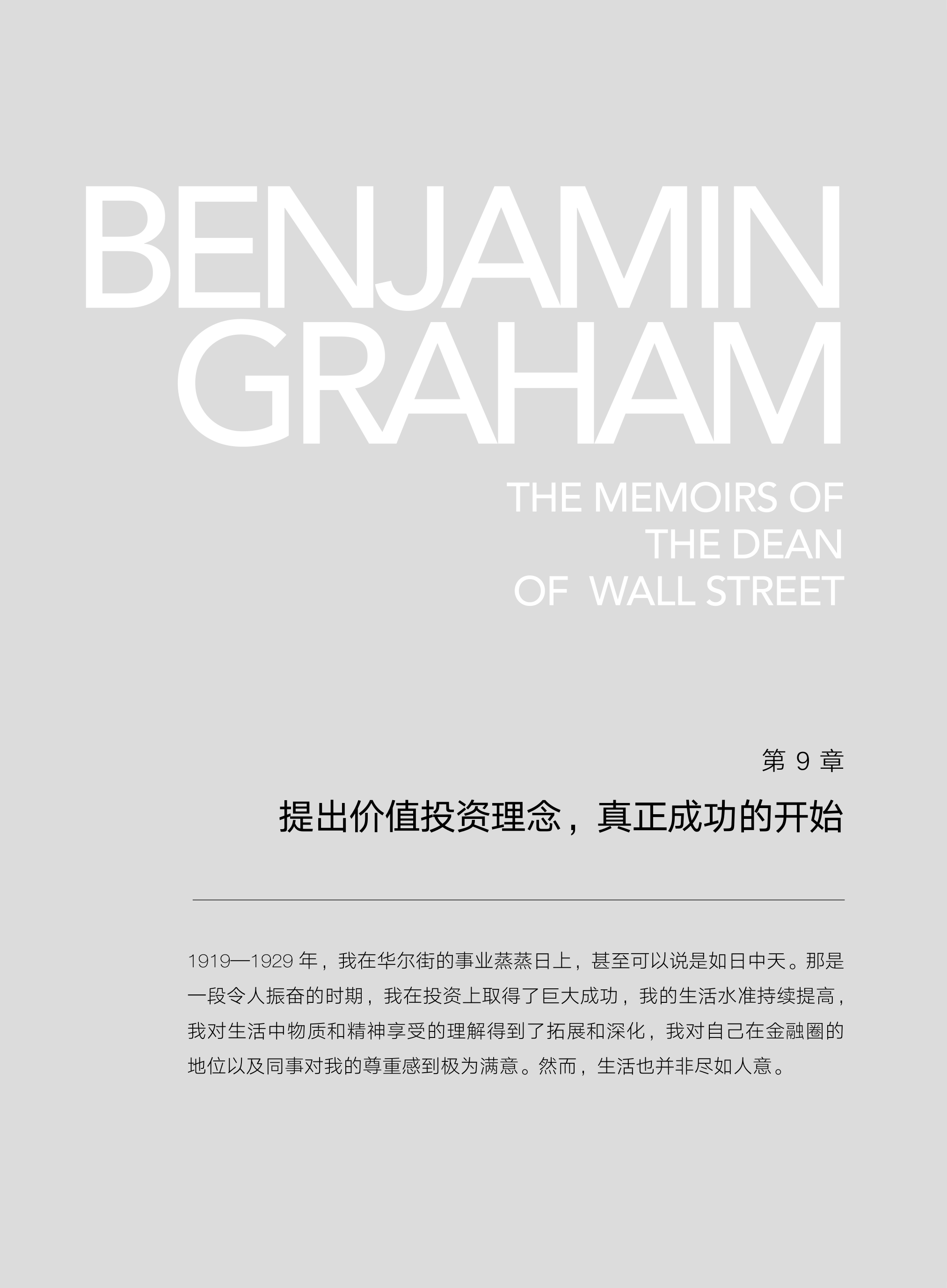 我以公司的名义写过3本小册子,题目叫“投资者的教训”。在25岁那个轻狂的年纪,我根本没有意识到这个题目的自大和我的无知,我竟然试图指导平均年龄至少比我大一倍的投资者。然而,我相信我写的内容是有价值的。我尤其感到骄傲的地方在于,我提出了以合理价格买入优质普通股的观点,并对此做出了有力的论证。我认为“如果一只普通股算是一笔好的投资,那它也是一种有吸引力的投机行为”。这在当时是极具创新性的观点。我的理由是,如果这笔投资是物有所值的,如果市场价格显著低于股票的内在价值,那么股票价格就应该会有巨大的上涨空间。只要大量的散户还没有追捧这样的股票,前述结论的确就是成立的。几年后,20世纪20年代的大牛市到来,散户开始追捧低估的股票,完全忘记了股价的安全边际,于是将之前稳健的投资行为变成了最为疯狂和危险的投机行为。