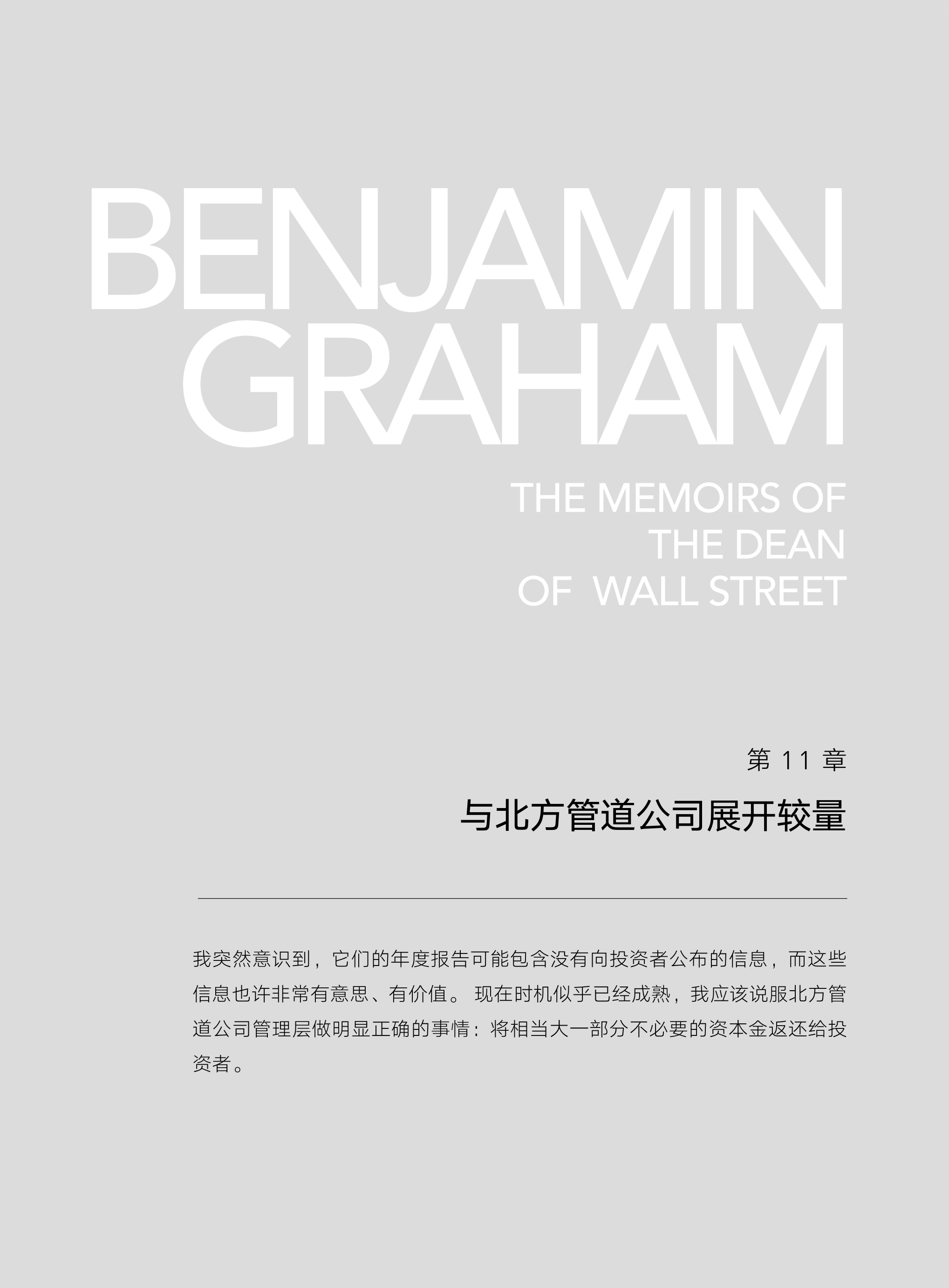 我的交易大多是基于可靠的分析买入被严重低估的普通股。而大多数被严重低估的靠谱股票正好就有像北方管道公司那样的情况:利润很少,可变现的资产很大,但又不肯分配给股东。我的策略是首先要获取这类公司极高的债券利息,然后想方设法适当改变公司的市值或运营策略。老华尔街人都把我视为堂吉诃德式的疯子,没有哪个有经验的人会浪费时间去试图从外部改变任何一家公司的政策,但我没有放弃。