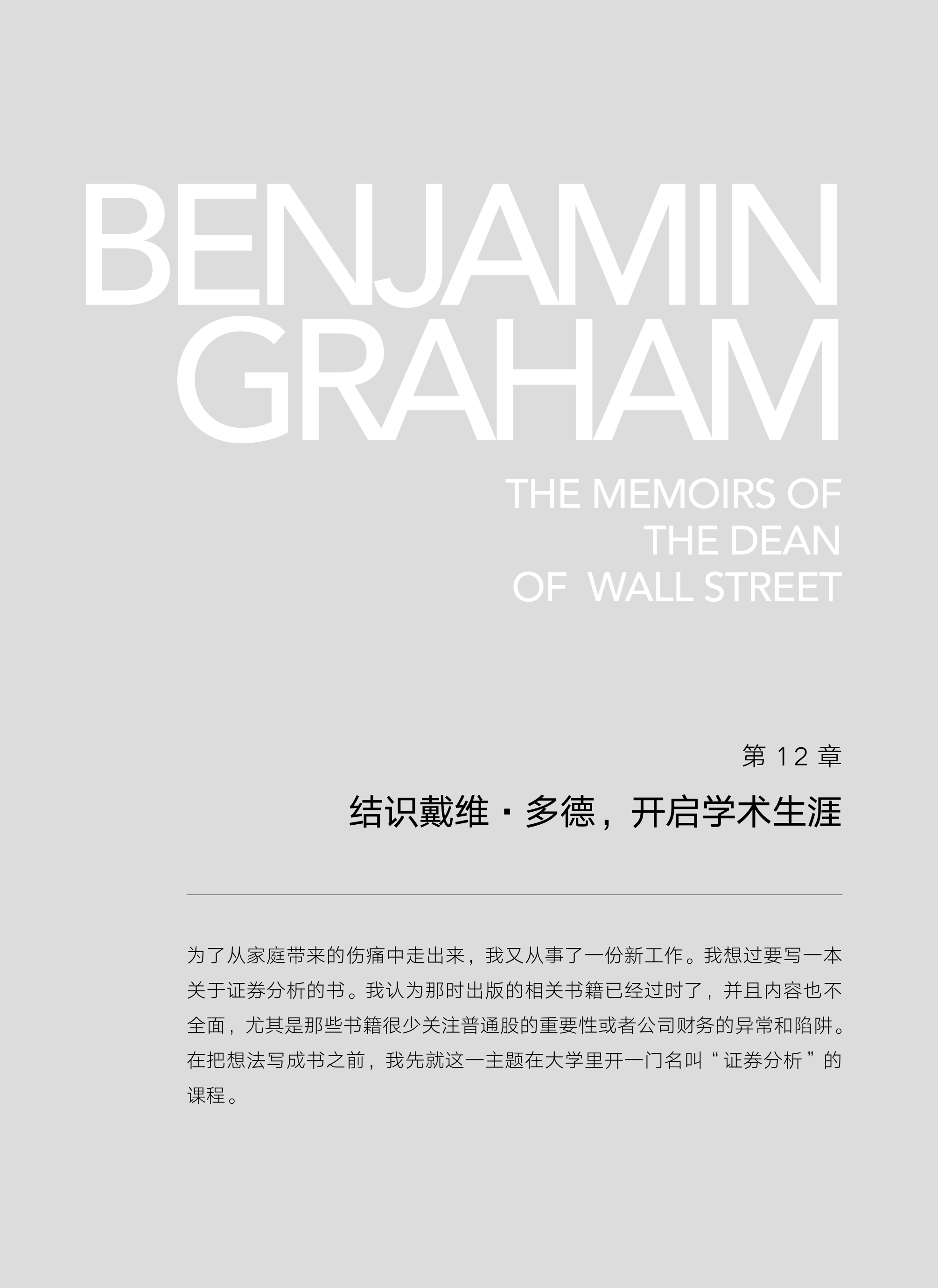 我的学术生涯就是这样开始的,并持续了40多年。其间,我在哥伦比亚大学和加州大学伯克利分校获得了各种教授头衔,还在其他机构举办了很多演讲课程。在我1927年的秋季课程中,有一位名叫戴维·多德的学生,当时他还是哥伦比亚大学商学院的助理教授,后来成了我的助教以及“华尔街圣经”《证券分析》一书的合著者。他还是我投资事业的重要合伙人以及可靠而忠诚的朋友。