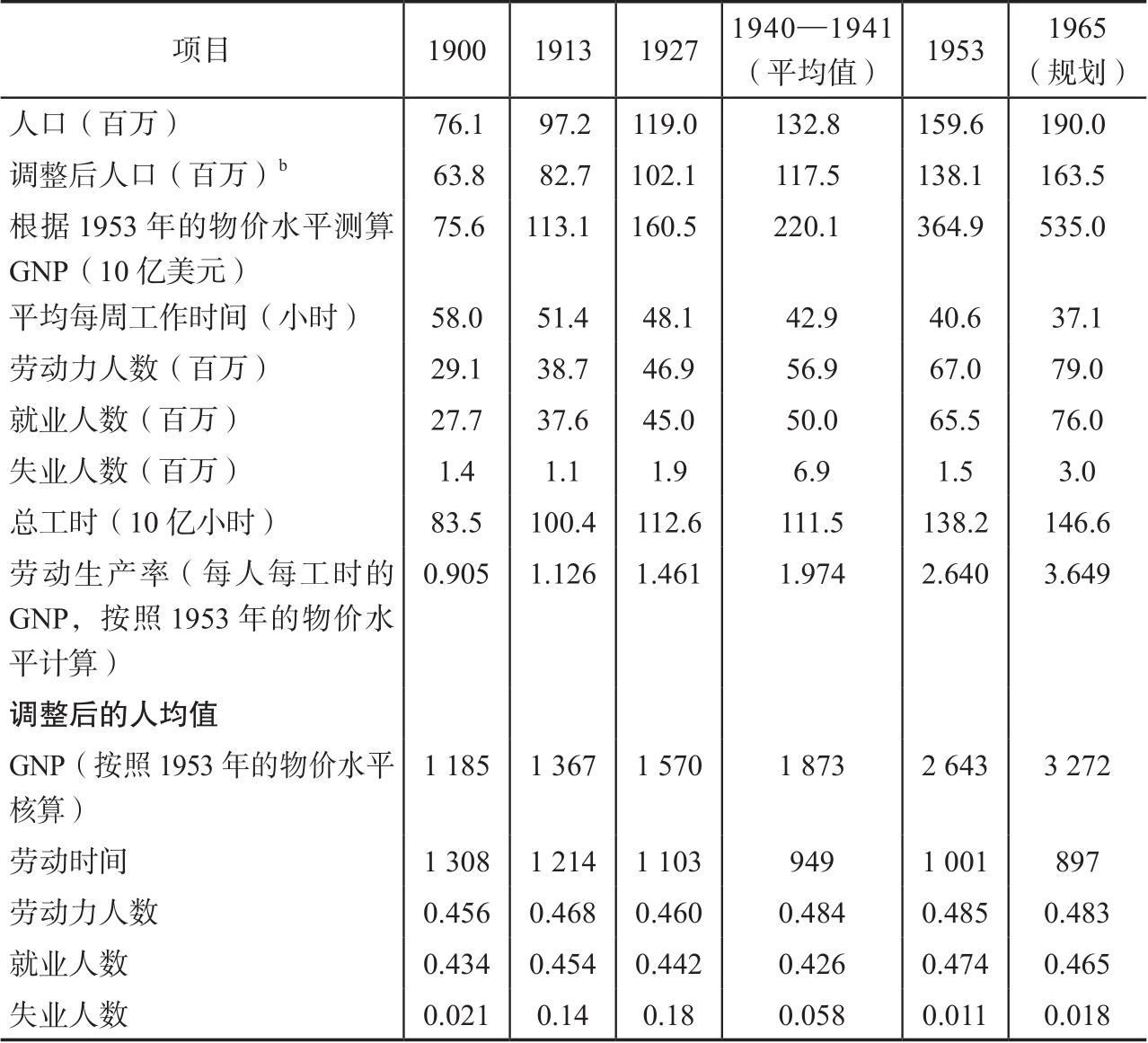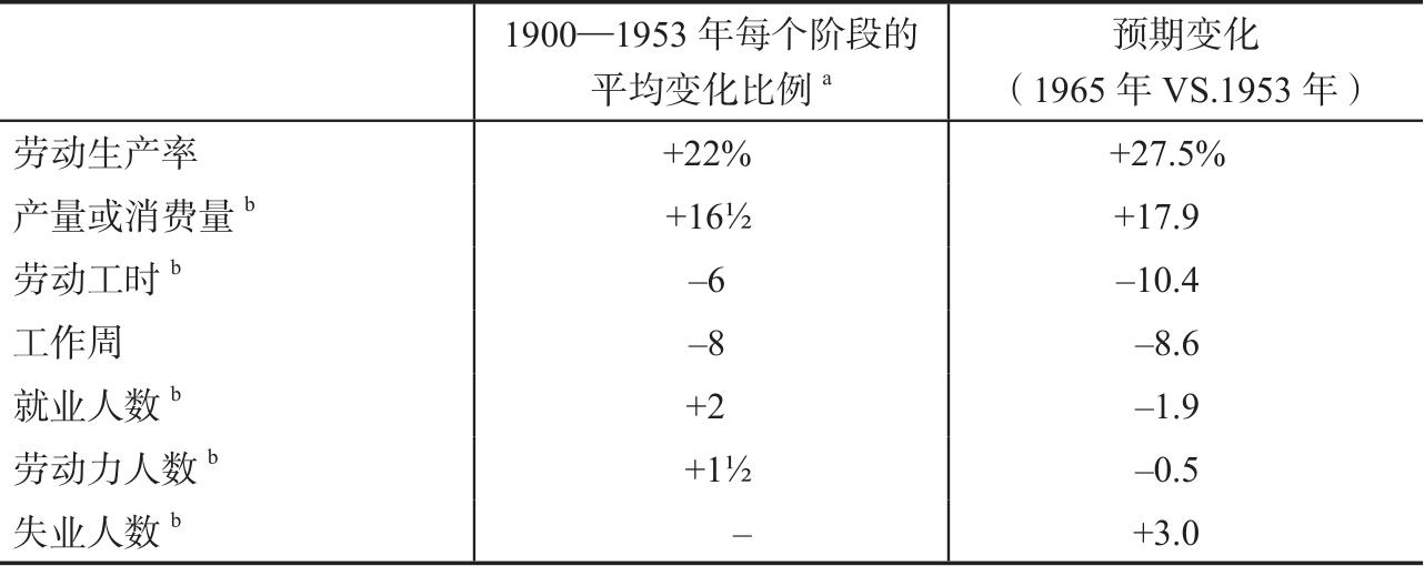 有必要强调的一点是,我们估算的劳动生产率增长速度要稍快于1940—1941年到1953年的增长速度。不过,预计的消费支出(人均GNP)将会比1940—1941年到1953年的水平稍微低一些。事实上,这一水平比1900—1953年整个期间的年平均水平还要高出10%。其结果就是引发大量的劳动生产力过剩(10.4%),人均所需的劳动工时数出现了相应的下降。