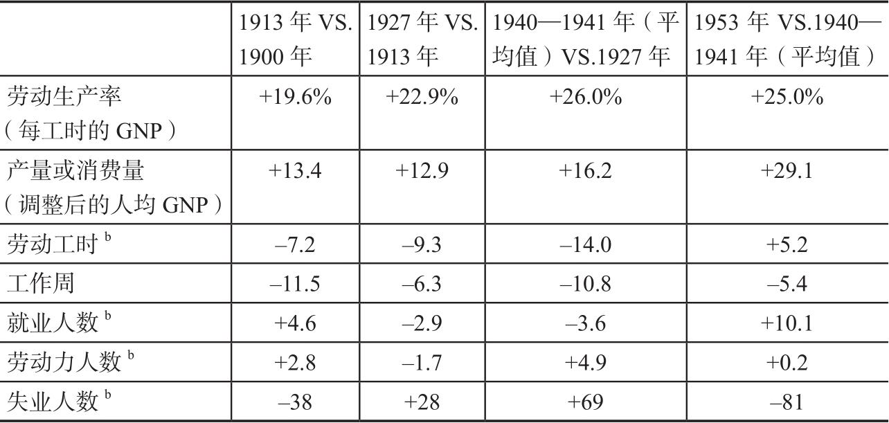 只要存在劳动生产力过剩,其必然的结果就是减少单位人口的人均工作时间。在1900—1953年期间,调整后的人均工作时间从1 308个小时下降到1 001个小时。如果每周的劳动时间没有缩短,那么人均就业率将会下降23%,因此1953年才会有1 600多万的劳动力人口失业。