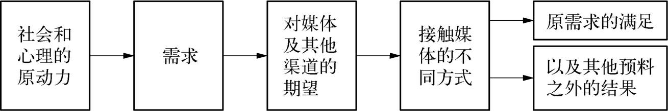 1974年E.卡茨在其著作《个人对大众传播的使用》中首先提出“使用与满足理论”(Uses and Gratifications)。使用与满足理论是大众传播学受众研究中的经典理论,该理论是站在受众的立场上,通过分析受众对媒介的使用动机和获得需求满足来考察大众传播给人类带来的心理和行为上的效用(见图2-13)。同传统的信息如何作用于受众的思路不同,它强调受众的作用,突出受众的地位。该理论强调:基于社会和个人心理需求的驱使,人们会主动诉诸大众媒体或其他渠道以满足这些需求。(郭庆光,2011)