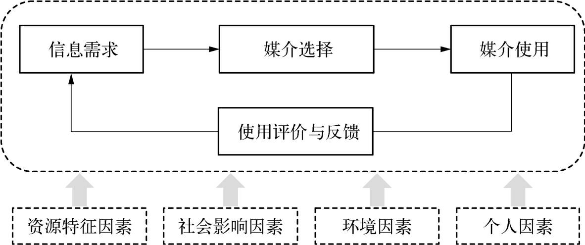 最后,合并同类影响因素。在影响因素归纳部分,本书根据人与媒介互动行为的主要特点,将威尔逊1996年信息行为模型中涉及个人的要素进行了合并。压力适应理论在媒介使用方面主要是涉及群体压力,即受到周围人际关系的影响,可以归纳如“社会影响因素”;社会学习理论中的自我效能感指受众使用媒介的主观能力认知,可归纳入“心理因素”;人口因素、个人背景因素、生理因素合并为“个人特征因素”;个人心理因素和个人特征因素都归属于“个人因素”。由此,该模型的影响因素部分主要涵盖四个主体因素,即:个人因素、社会影响因素、环境因素和资源特征因素。