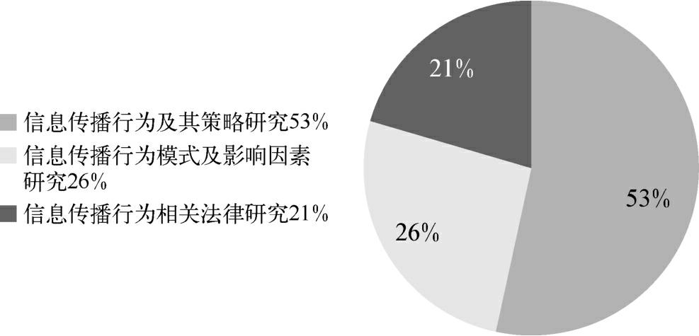 截至2015年1月,以“信息传播行为”为关键词作题名检索,经筛选后获得核心文献98篇。其中,信息传播行为及其策略研究52篇,占比53%;信息传播行为模式及影响因素研究25篇,占比26%,信息传播行为相关法律研究21篇,占比21%。