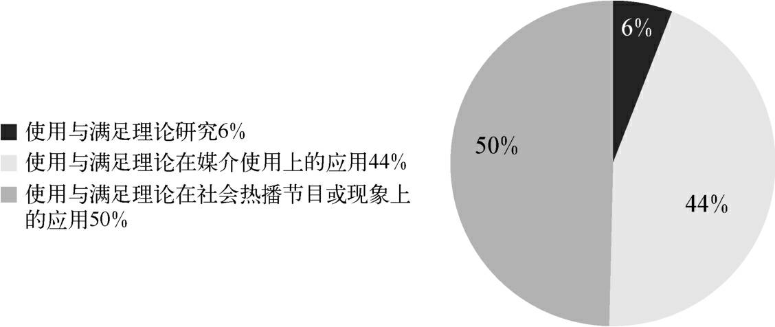 截至2015年1月,以“使用与满足”为关键词作题名检索,经筛选后获得核心文献135篇。其中,该理论应用在热播节目或现象上的研究有67篇,占比50%;该理论应用于媒介使用方面的研究有60篇,占比44%;而关于该理论本身的研究有8篇,占比6%。
