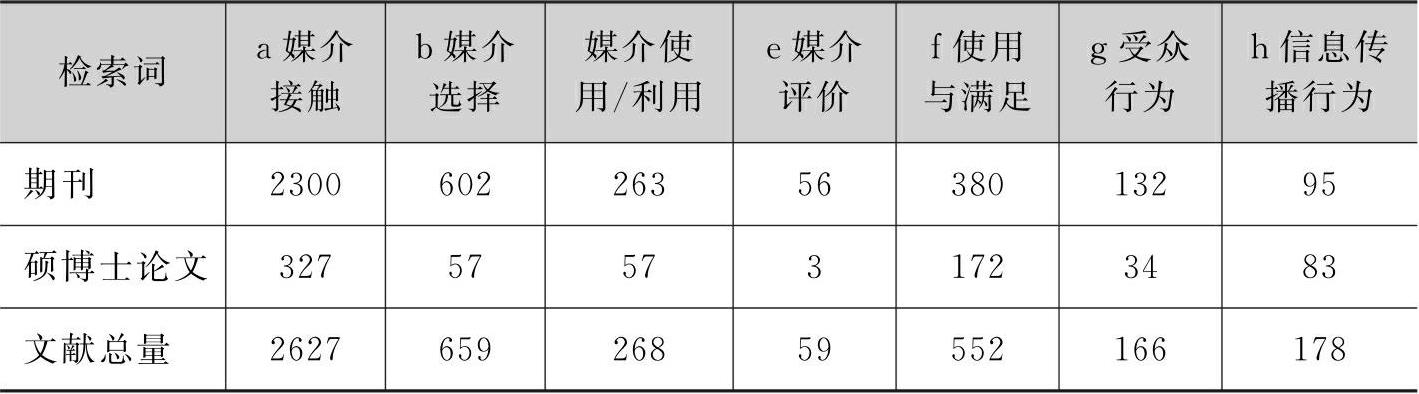 二是从信息行为的各个行为环节入手,对信息行为进行分解,借鉴传播学研究中惯用词汇,拟定对应的检索词为“媒介接触”“媒介选择”“媒介使用”或“媒介利用”与“媒介评价”。其中,“媒介使用”和“媒介利用”都属于媒介使用行为研究的关键词,两者内涵相同。
