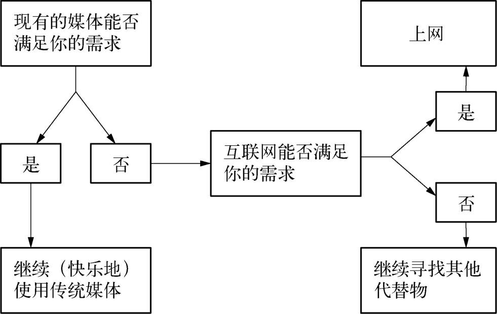 他在这些理论基础上结合期望价值理论,提出“新媒体权衡需求理论”(见图2-14)。该理论的核心观点是:如果一个人越是相信互联网比传统媒体更能够满足其某种重要需求,那么他/她就越有可能采纳互联网和更多地使用互联网。而且,非常重要的一点是,权衡需求对采纳和使用互联网的影响作用是纯粹的,是独立于个人特征和社会经济特征之外的。