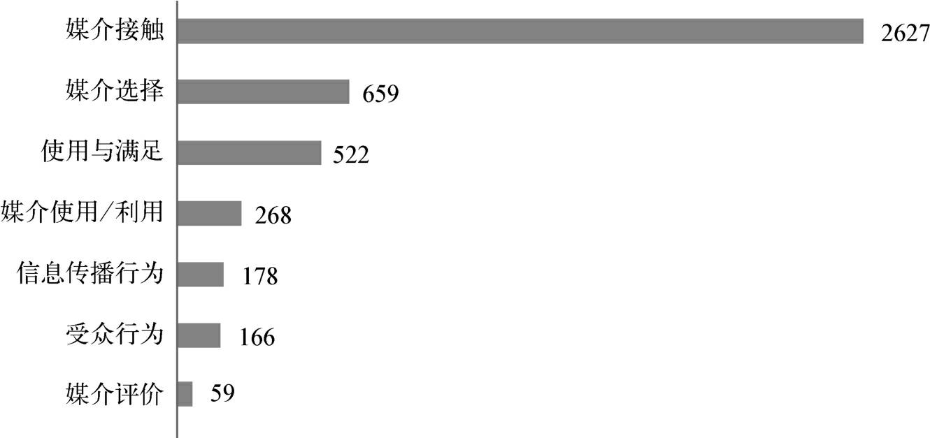 “媒介接触”相关研究排名第一,远超其他检索词,可见“媒介接触”一词是传播学受众行为研究的热点词汇。