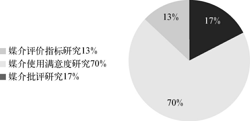 以“媒介评价”为关键词作题名检索,获得核心文献23篇。其中媒介使用满意度研究有16篇,占比70%;媒介批评研究4篇,占比17%;媒介评价指标研究3篇;占比13%。