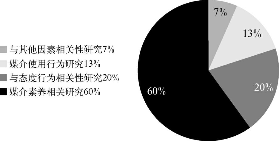 截至2015年1月,以“媒介使用”为关键词作题名检索,经筛选后获得核心文献90篇,其中媒介素养研究54篇,占比60%;与态度行为相关性研究18篇,占比20%;媒介使用行为研究12篇,占比13%;与其他因素相关性研究6篇,占比7%。