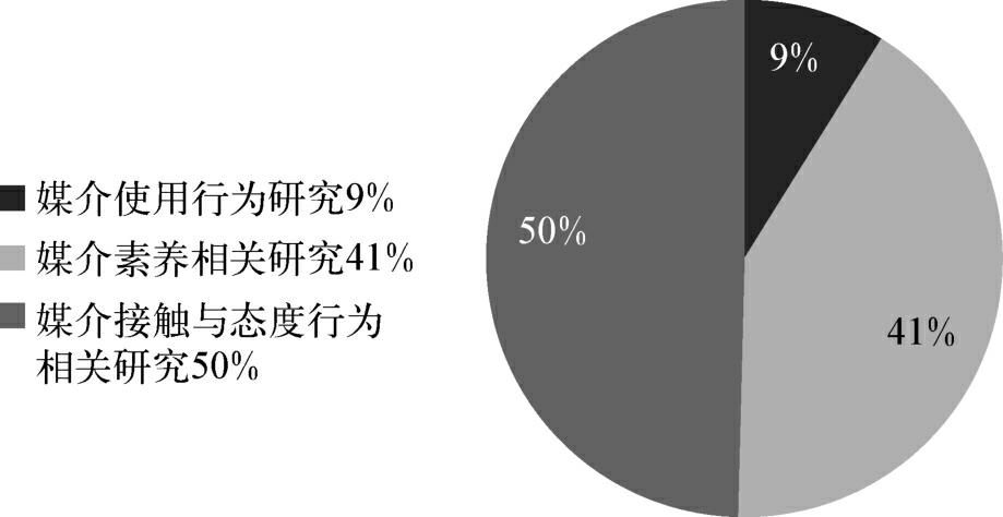3)仅有的9%的行为类研究文献,只是描述行为的特点,主要涉及使用媒介的时间、数量、种类、频率和地点的统计分析。很少有研究比较不同人群之间的行为异同,也没有研究致力于解释行为机制。