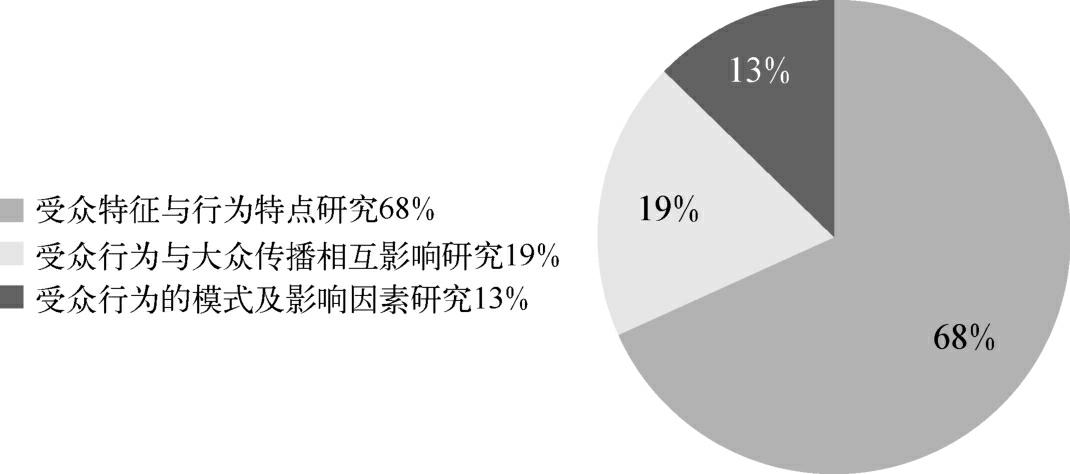 截至2015年1月,以“受众行为”为关键词作题名检索,经筛选后获得核心文献126篇。其中,受众特征与行为特点相关研究86篇,占比68%;受众行为与大众传播相互影响的研究24篇,占比19%;受众行为的模式及影响因素的研究13篇,占比13%(见图2-8)。