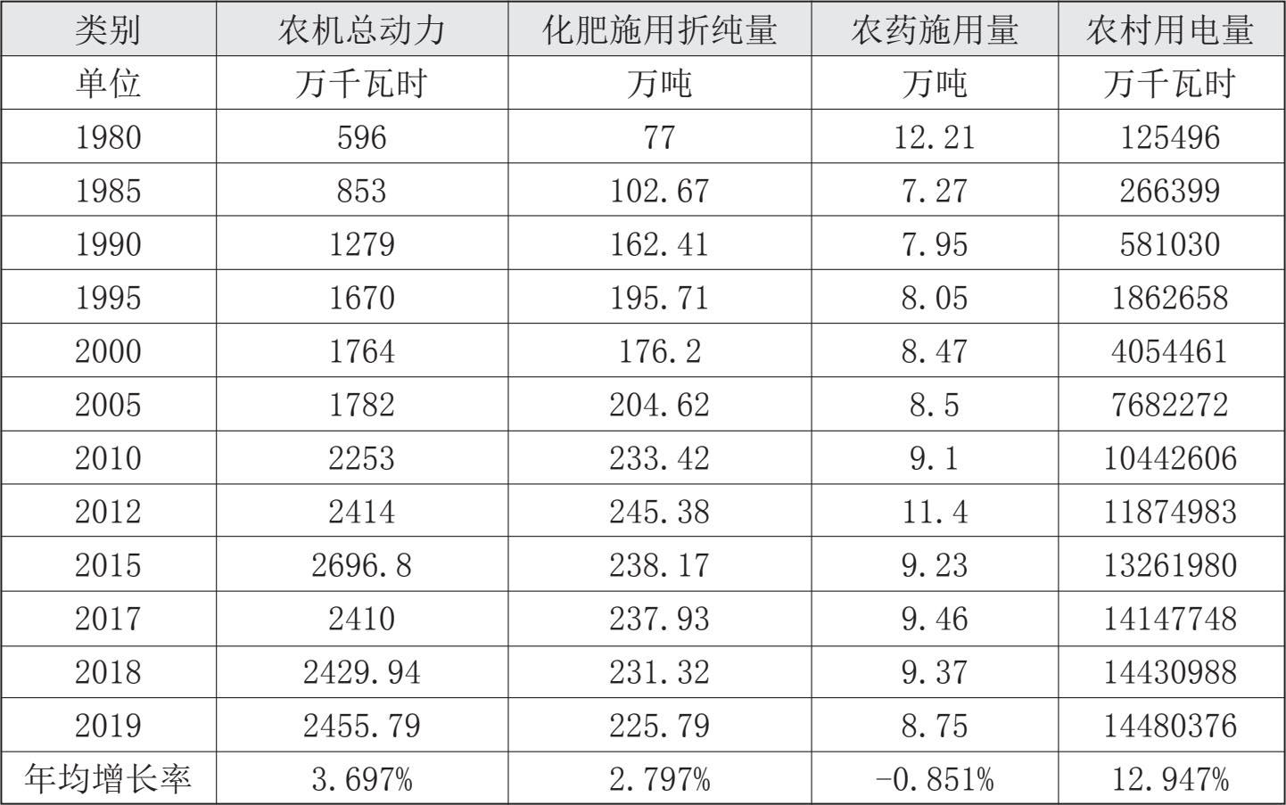 现代农业技术装备的广泛应用改善了农业生产条件,减少了农业从业人员,大幅提高了广东农业劳动生产率。1980—2019 年,从农业机械化作业情况看,全省农机总动力从 596 万千瓦增加到 2455.79 万千瓦,年均增长率为 3.697%。全省农机化总体情况是总机耕面积 3724.21 千公顷,机播面积 404.32 千公顷,机电灌溉面积 1789.28 千公顷,机械植保面积 1542.77 千公顷,机收面积1825.78 千公顷。主要农作物农机化作业情况是水稻机耕面积 1763.45 千公顷,水稻机械种植面积 382.55 千公顷,水稻机收面积 1651.77 千公顷,玉米机耕面积 94.47 千公顷,大豆机耕面积 23.15 千公顷,花生机耕面积 255.71 公顷。根据 2019 年水稻播种面积 179.367 万公顷计算,2019 年全省水稻耕种收综合机械化水平达 70.58%,高于 2018 年的 68%。与此相对应,1980—2019 年全省农村用电量从 125496 万千瓦时增长到 14480376 万千瓦时(见表 3-6)。