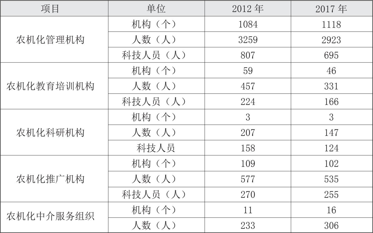 表3-7 2012年、2017年广东省农机化服务组织及人员情况(单位:个)
