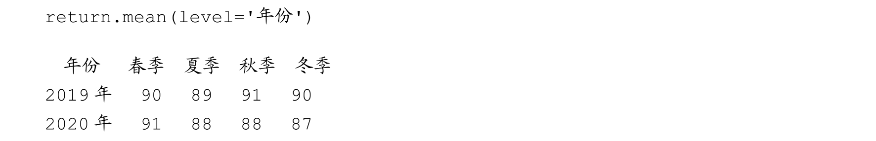 可以使用level参数选项指定在某列上进行数据统计,例如统计最近两年的平均退单量,示例代码和输出如下: