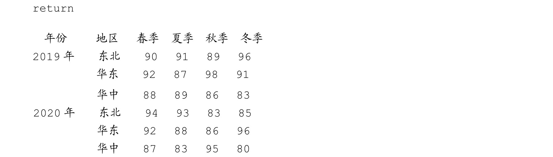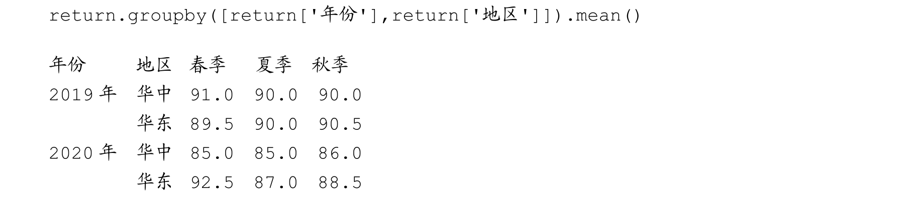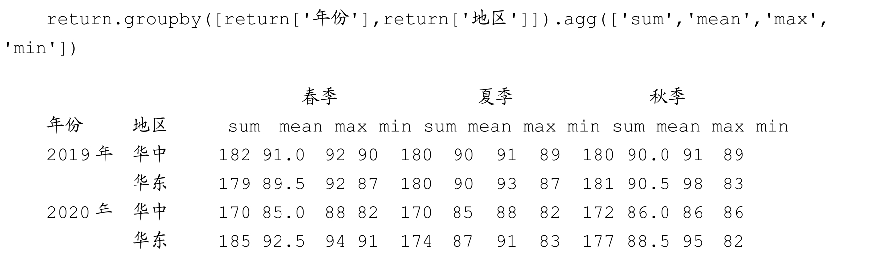 此外,groupby()函数可以实现对多个字段的分组统计,例如统计最近两年不同地区的平均退单量,示例代码和输出如下: