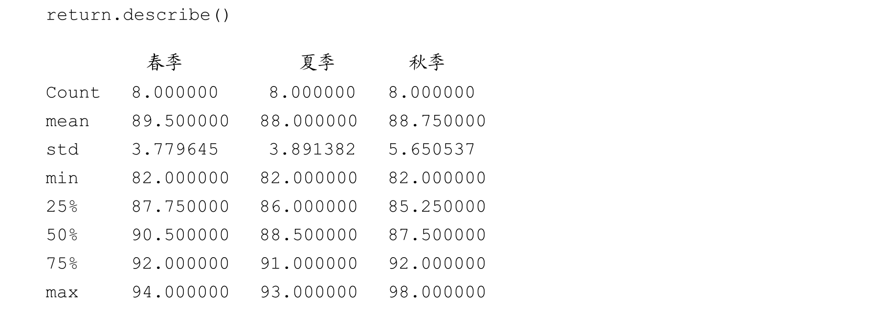 在Python中,计算一些描述性统计指标通常是调用describe()函数,例如个数、平均值、标准差、最小值和最大值等,示例代码和输出如下: