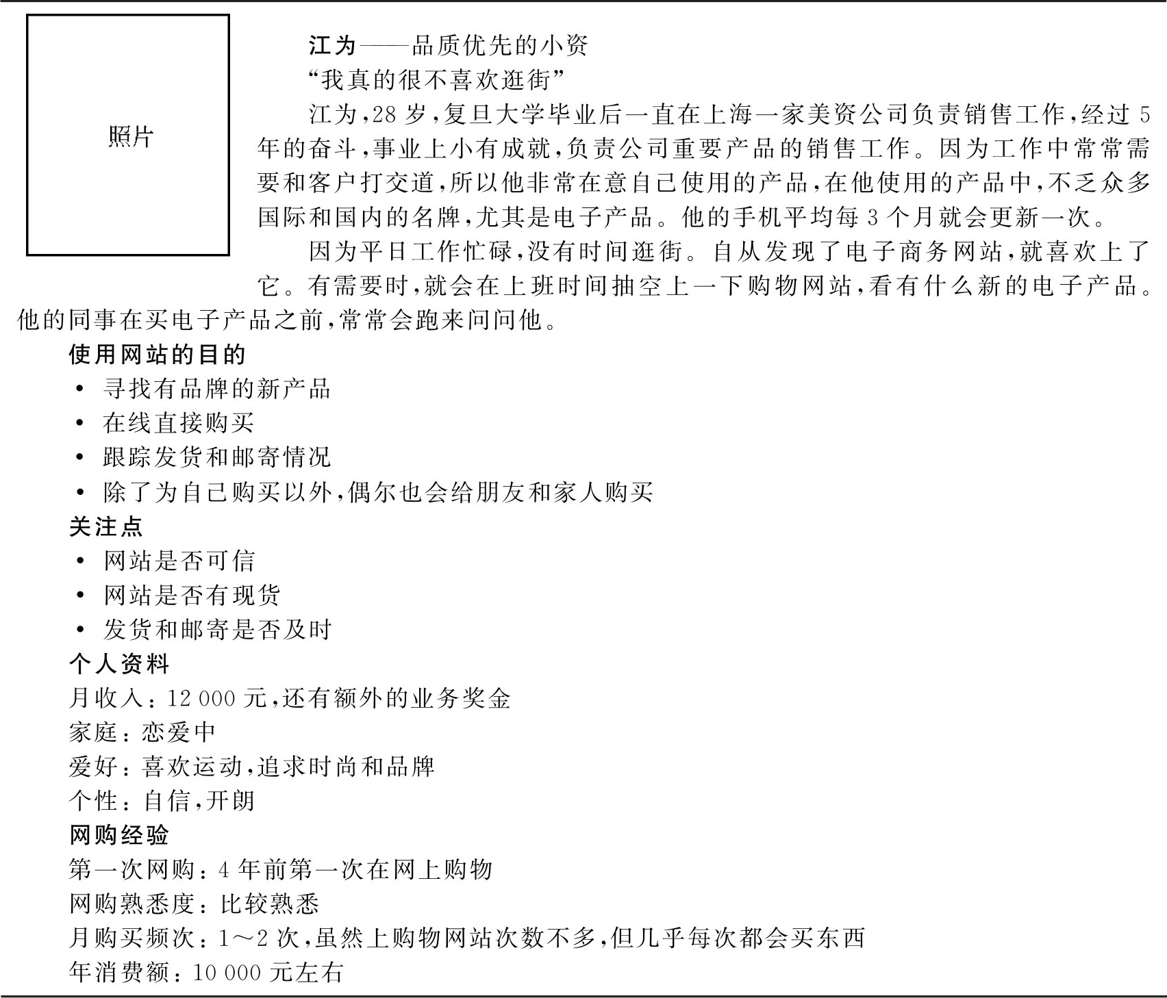 为了让角色比较好记,相片和一个短句是很重要的。短句是用很精练的一句话来概括这个角色,例如在表2-1中为电子商务公司建立的角色里,“品质优先的小资”,短短的一句话,可以给人带来很深的印象。表2-1为一个角色的例子,供读者参考。