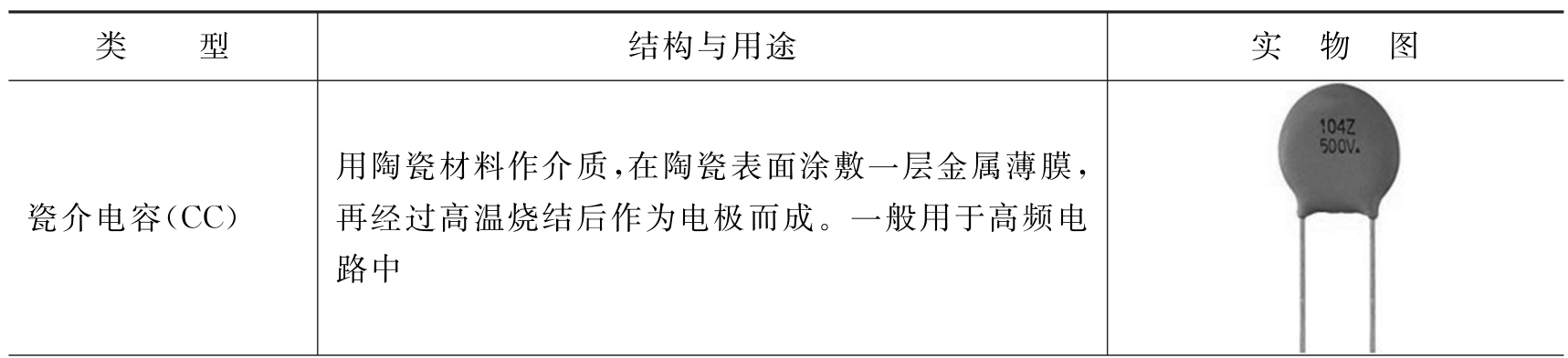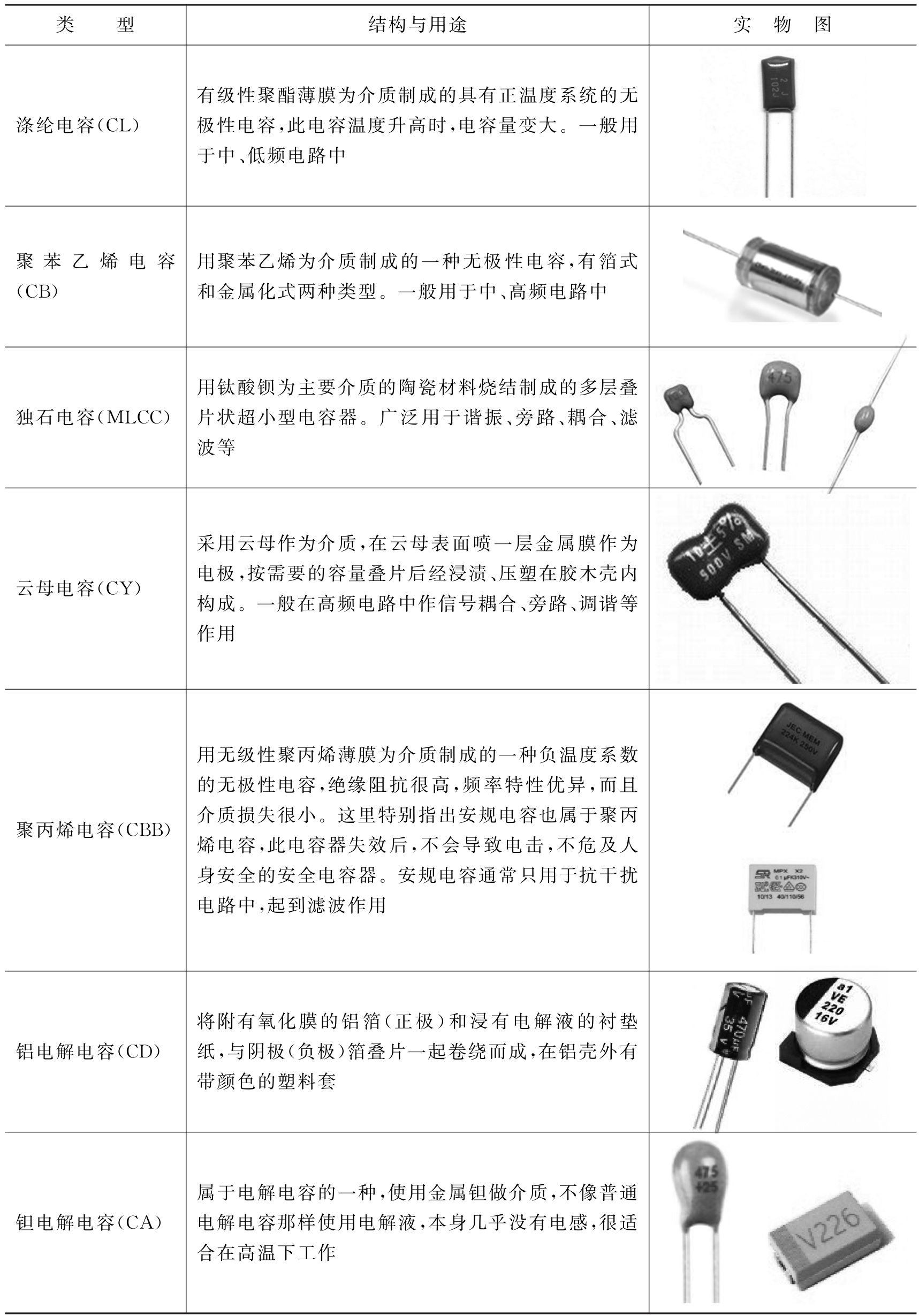 从制作工艺与材料上可以将电容分为瓷介电容、涤纶电容、云母电容、独石电容、铝电解电容、钽电解电容等,具体如表1-3所示。