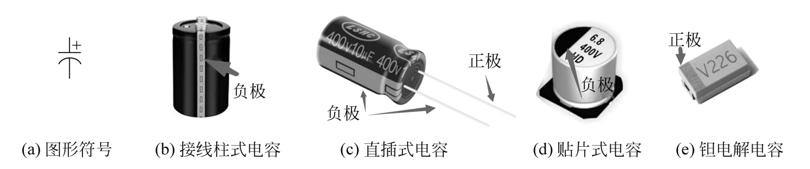 按级性可将电容划分为 有极性 无极性电容 。有极性电容一般用于直流电源中,其图形符号可以表示为图1-10(a)所示,在实际连接过程中需要注意其正反极。对于接线柱式电容,套管上有明确的正负极标识,正极用“+”、负极用“-”表示,如图1-10(b)所示;对于直插式电容正极一般引脚长、负极引脚短,如图1-10(c)所示;有的也会和接线柱式电容一样在套管上进行标记;对于贴片式铝电解电容在外观有半边黑色被涂黑标记对应引脚为负极,如图1-9(d)所示;对于贴片钽电解电容会在表面有一横杠,代表正极,如图1-10(e)所示。