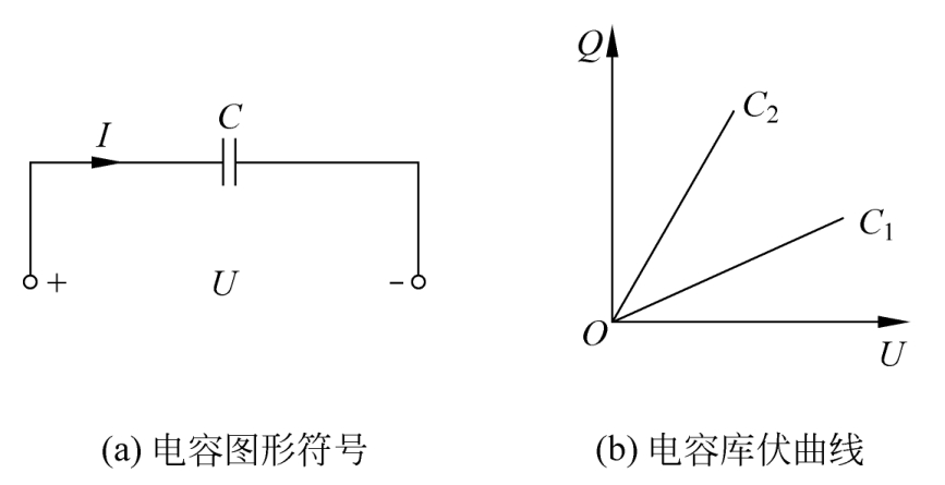 式中, C 为电容元件的参数,称为电容元件的电容值,单位为F(法拉,简称法),由于单位法拉太大,因此在实际应用中常用单位是μF(微法)和pF(皮法)。 Q 为电容两端的电荷,单位为C(库伦,简称库),以 Q U 作为坐标轴可以画出电容的 库伏曲线 ,如图1-7(b)所示,线性电容的库伏曲线是过原点的直线。