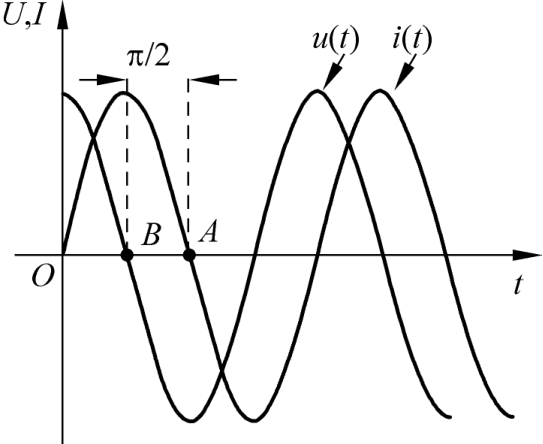 此时电容两端电压与电流关于时间 t 的波形如图1-8所示。通常,将同一个周期内两个波形与横坐标的两个交点(正斜率过零点或负斜率过零点)之间的坐标差值看成两者的相位差,先到达零点的波形超前后到达者。可以看出,电容两端电压 U 前流过电容电流 I ,相位相差90°。图1-8,虽然为 ω U m C 取特定值时产生的波形,但由式(1-12)可得,这些参数只会影响波形幅值,并不会影响电容的电压与电流之间相位的关系。