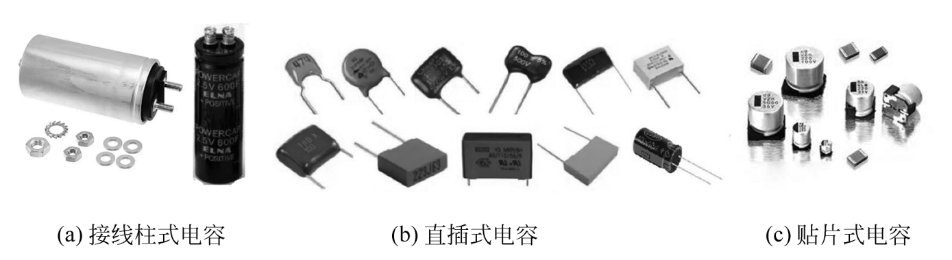 可以从封装形式上将电容分为 接线柱式 直插式 贴片式 3种,接线柱式电容实物如图1-9(a)所示,此类电容通常可以承受非常高的电压或非常大的电流,因此其体积也非常大;直插式电容体积次之,实物如图1-9(b)所示;贴片式电容体积最小,实物如图1-9(c)所示。
