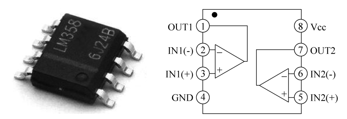 图2-12 LM358运算放大器的实物图与引脚图