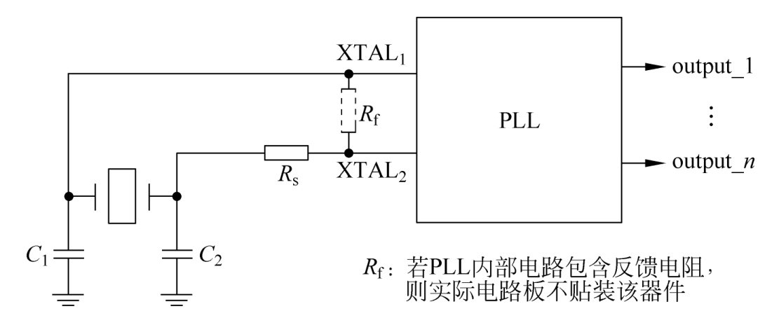 该PLL采用外部晶体作为本地时钟(本振),输出多路、不同频率的时钟。电容 C 1 、 C 2 作为匹配晶体的起振电容,图2.1中的XTAL 1 与XTAL 2 引脚间保留反馈电阻的位置 R f (一般为MΩ级,该PLL内部已包含反馈,因此图2.1中 R f 不贴装),端接 R s 电阻防止时钟对晶体产生电流过驱动。这是一个非常经典的时钟晶体电路连接原理图。
