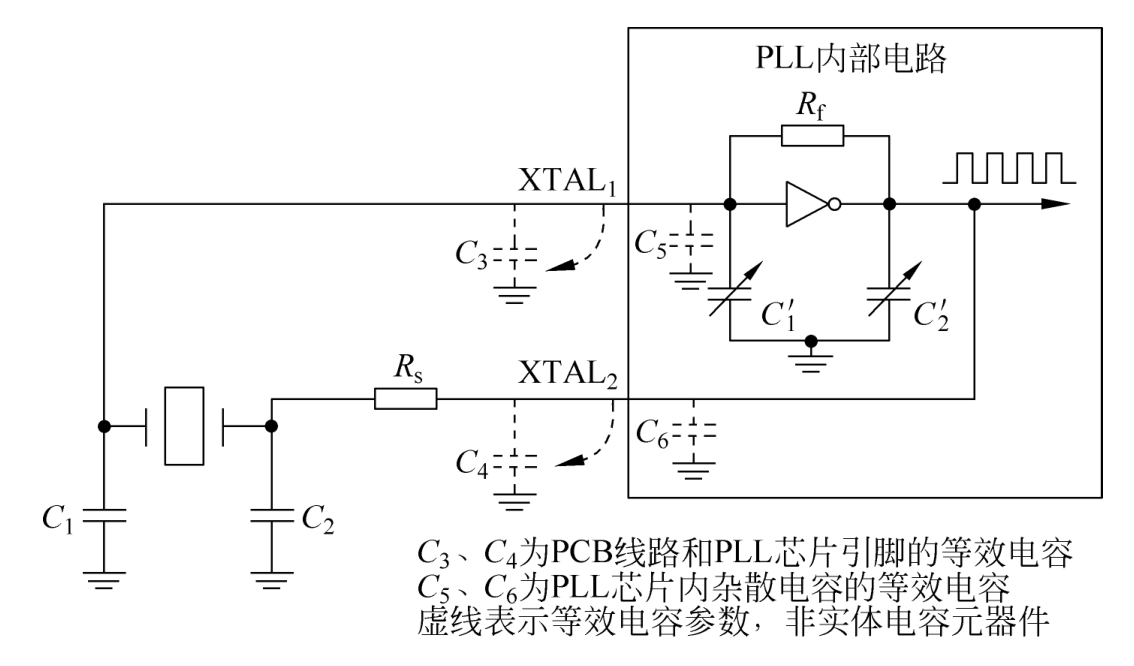 C 3 、 C 4 视作PCB线路和PLL芯片引脚的等效电容,例如1in的PCB线路等效成2.5~3.5pF容值的电容。芯片引脚也存在容性效应,根据芯片封装的差异,引脚存在几皮法的容性效应。