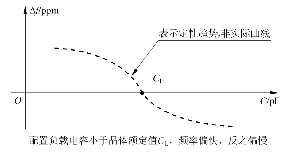 多片单板的时钟频率普遍偏慢的现象是故障排查的重要切入点。思考该时钟电路模块中哪些参数可能引发频率偏慢,在前文的论述中,已经排查了PLL参数配置和晶体标称频率参数。在剩余参数中还存在一个影响晶体频率偏差的参数——晶体的负载电容 C L ,这是晶体的固有参数,晶体的振荡频率偏差与晶体电路的负载电容值存在关系(这个关系是非线性的)。晶体实际带载的负载电容等于其额定值时,发生频率偏差最小。实际带载电容较小时,频率偏快;带载电容较大时,频率会偏慢,其定性趋势如图2.2所示。