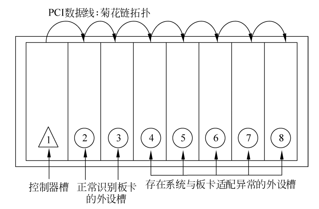 一款早期含PCI总线(Peripheral Component Interconnect Bus,外设部件互连总线,一种计算机总线标准)的机箱产品,背板包含1个控制器槽(插CPU卡,有的机箱定义为0槽,称为“零槽控制器”),7个外设槽(插I/O卡),其中外设槽按照距离控制器物理位置由近及远依次编号为2~8槽。