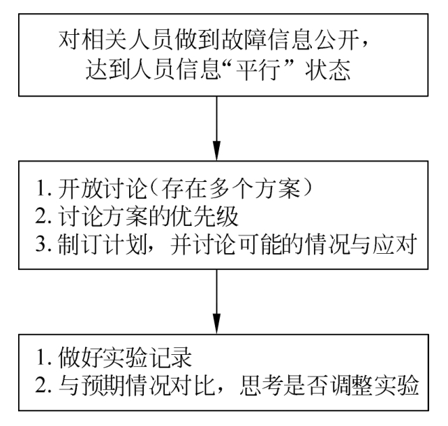 (1)在故障排查相关人员中(特别注意“相关”的真正含义),对已知信息做到公开。目的是相关人员做到信息对等,要求讲解人客观释放信息,切忌“带节奏”和“我认为”。