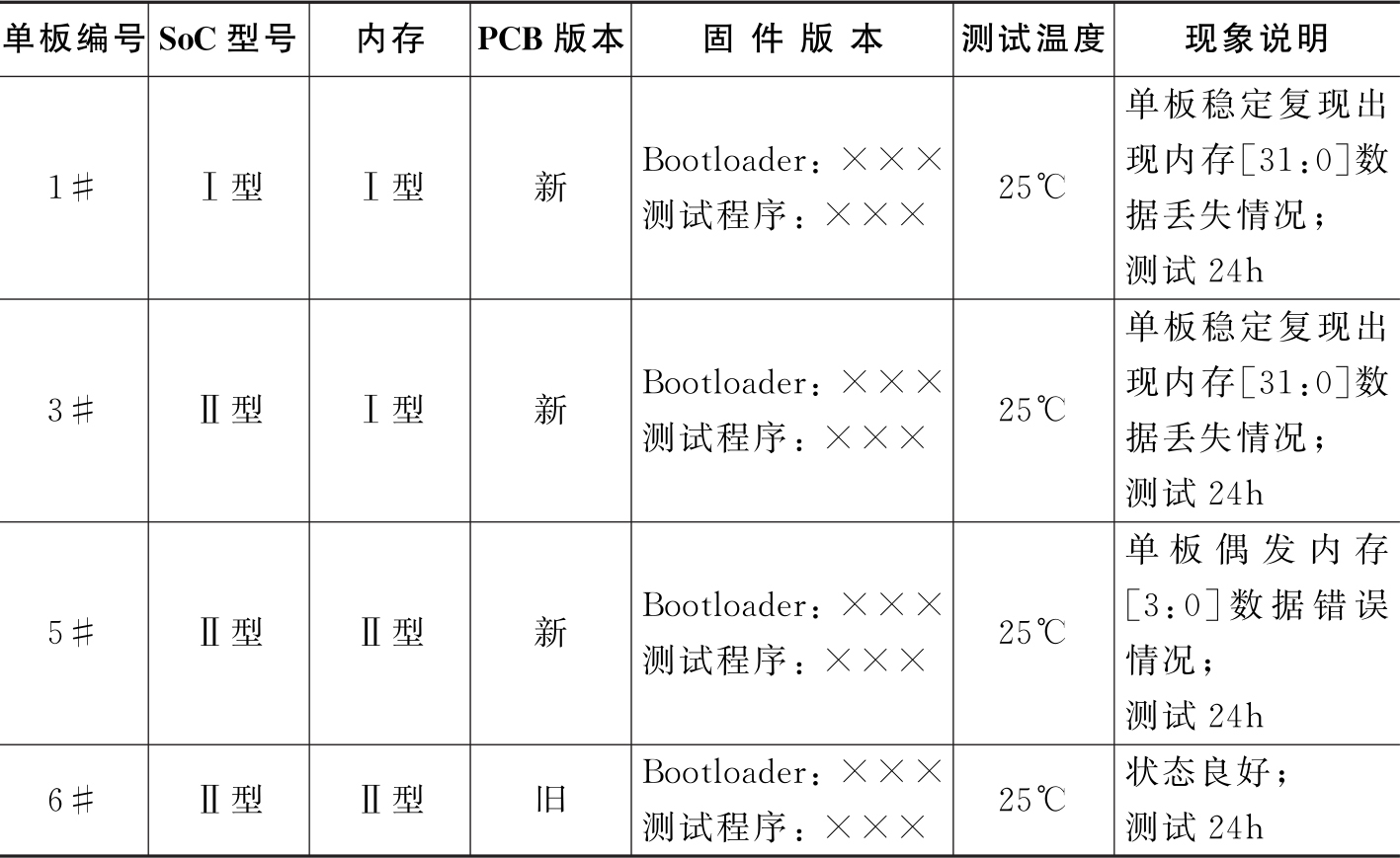 故障案例现象的初步描述:某系统计算机核心模块处于稳定产品状态,因系统关键元器件/部件需要兼容代替,更换主存储器物料和电路板生产厂商后,出现了一定比例的内存数据错误和丢失的故障,并伴有在温度循环试验中,故障概率升高的现象……。故障案例整理报告如表1.1所示。