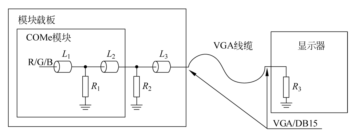 图1.9中,计算机COMe模块中的R、G、B接口均设置一个150Ω的对地电阻,相应地,在COMe载板上的对应接口也设置一个150Ω的对地电阻,两者并联,即控制器整体的对地电阻为75Ω。显示器端包含一个75Ω的对地电阻。整体链路对地电阻并联后为37.5Ω。这也是有的布局布线(Layout)规范中要求阻抗约束 L 1 =37.5ohm、 L 2 =50ohm、 L 3 =75ohm的原因。