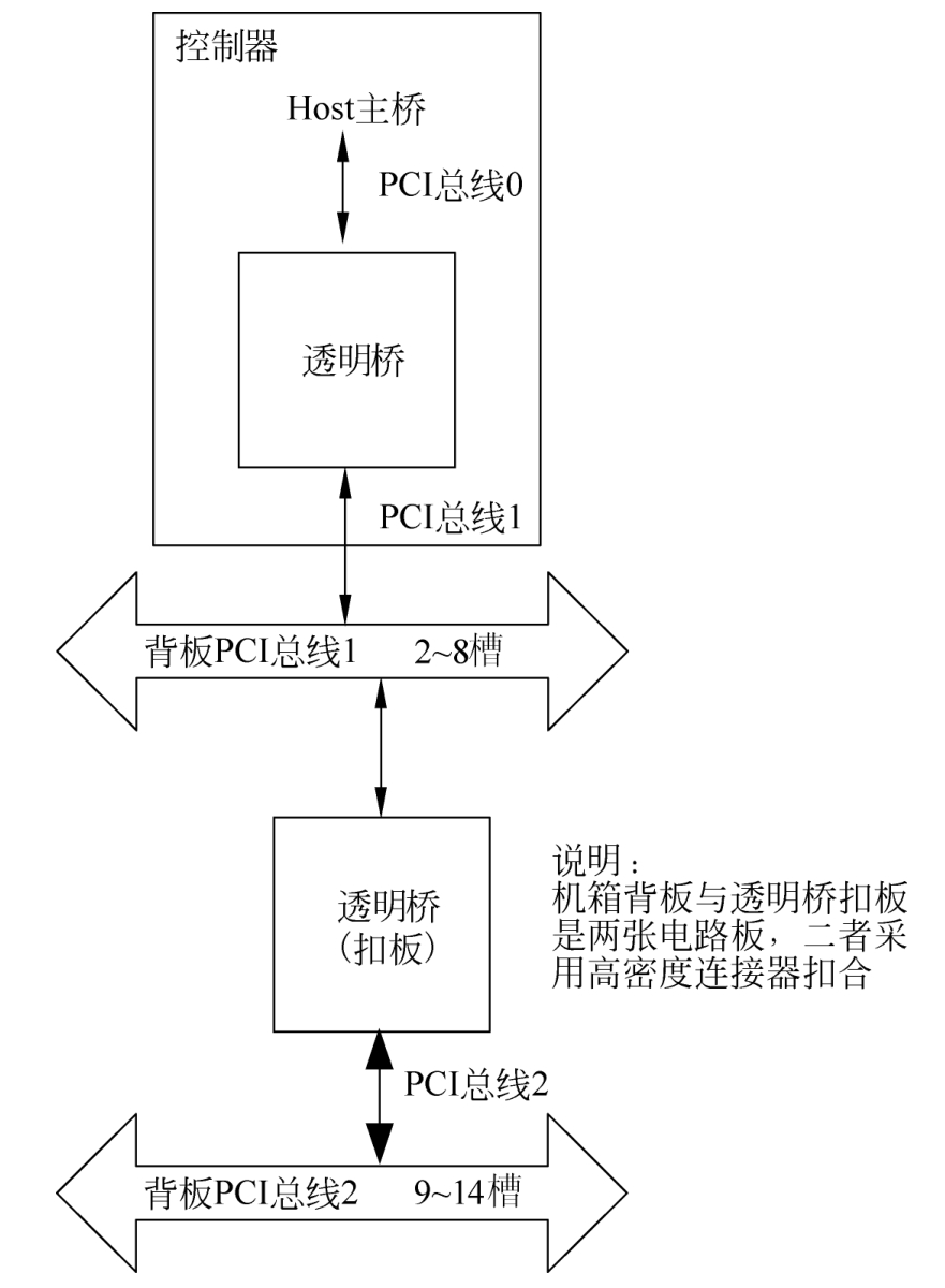 在1.2节中,阐述了案例2的现象与“功率不足”这种假设的验证,说明了其假设的不合理性。此处进一步描述系统框架,并解释故障的根本原因。图1.3所示为该机箱和控制器系统的框架图。因为PCI总线是菊花链拓扑,透明桥的驱动能力有限,故系统的9~14槽需要第二级透明桥来扩展。