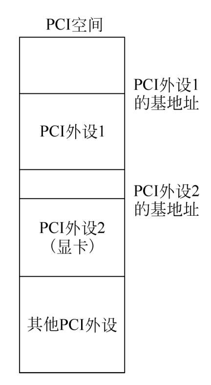 第二个概念与PCI设备的地址空间相关,所有的PCI设备映射到共同的一段地址空间——PCI空间,以便PCI设备的统一编址。每个PCI设备分配一段地址,如图1.7所示为PCI空间及PCI外设存储空间。每个PCI外设的基地址保存在自身的基地址寄存器(Base Address Register,BAR)中,类似上述第一个概念中的3个总线号寄存器,基地址寄存器也是PCI外设配置空间寄存器中的一部分。