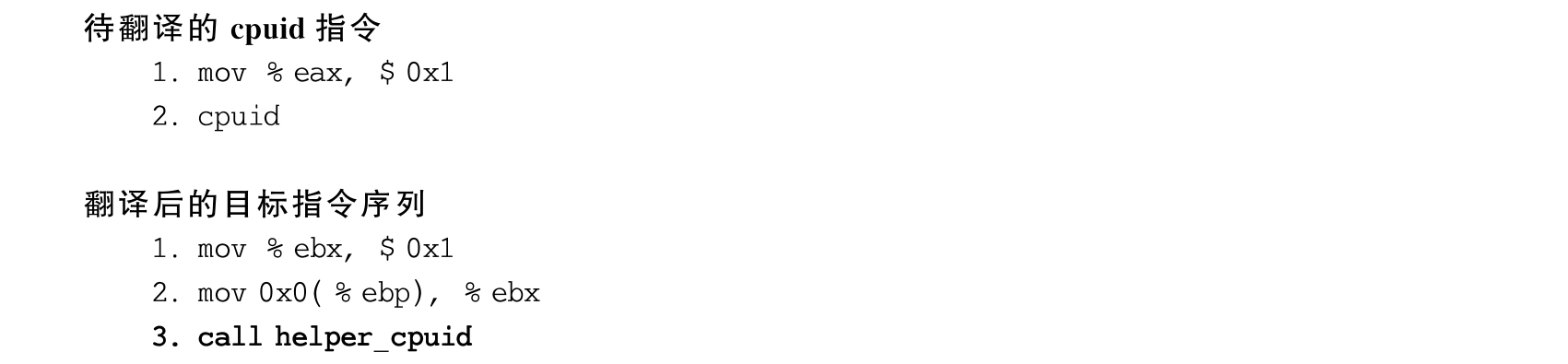 基于软件的全虚拟化技术采用解释执行、扫描与修补、二进制翻译(Binary Translation,BT)等模拟技术弥补虚拟化漏洞。解释执行采用软件模拟虚拟机中每条指令的执行效果,相当于每条指令都需要“陷入”,这无疑违背了虚拟化的高效原则。扫描与修补为每条敏感指令在Hypervisor中生成对应的补丁代码,然后扫描虚拟机中的代码段,将所有的敏感指令替换为跳转指令,跳转到Hypervisor中执行对应的补丁代码。二进制翻译则以基本块为单位进行翻译,翻译是指将基本块中的特权指令与敏感指令转换为一系列非敏感指令,它们具有相同的执行效果。对于某些复杂的指令,无法用普通指令模拟出其执行效果,二进制翻译采用和类似扫描与修补的方案,将其替换为函数调用,跳转到Hypervisor进行深度模拟。以如下x86指令集中cpuid指令的执行代码为例。cpuid指令是x86架构中用于获取CPU信息的敏感指令。经过二进制翻译后,将其替换为对helper_cpuid的函数调用,即获取虚拟CPU的配置信息并返回,模拟出真实cpuid指令的执行效果。翻译前后代码如下。
