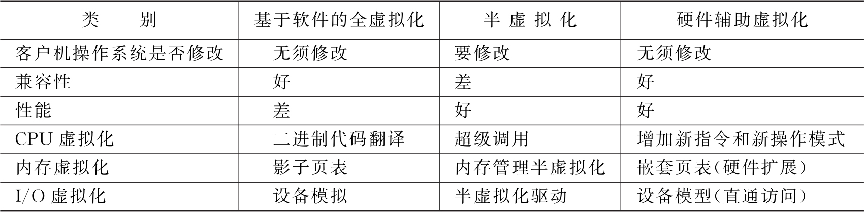 系统虚拟化技术按照实现方式可以分为基于软件的全虚拟化技术、硬件辅助虚拟化技术和半虚拟化技术。一般来说,虚拟机上的客户机操作系统“认为”自己运行在真实的物理硬件资源上,但为了提升虚拟化性能,会修改客户机操作系统使之与Hypervisor相互协作共同完成某些操作。这种虚拟化方案称为PV(Para-Virtualization,半虚拟化),与之对应的是全虚拟化(Full Virtualization),无须修改客户机操作系统就可以正常运行虚拟机。下面分别从基于软件的全虚拟化、硬件辅助虚拟化和半虚拟化三个方面对上述虚拟化实现技术进行分析。